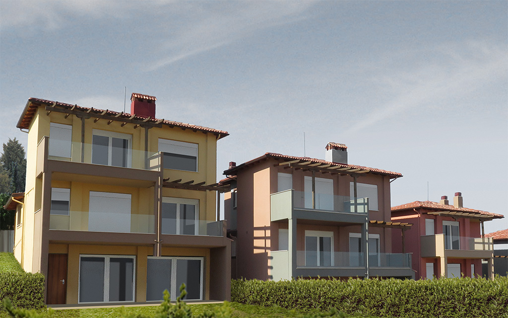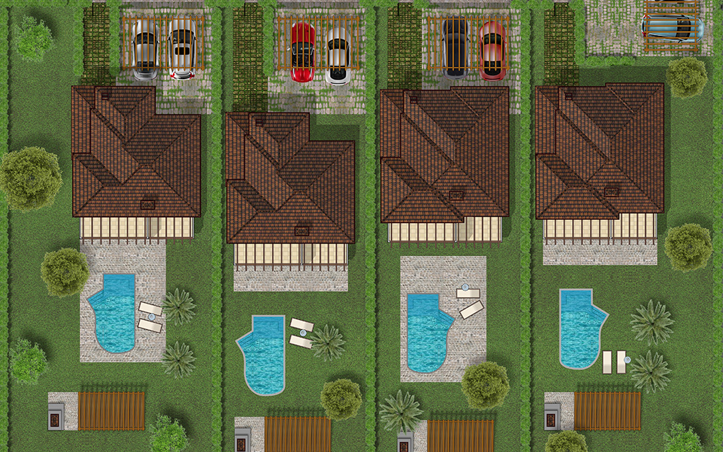 This is a “neighborhood”, of four 2-story maisonettes with a ground floor, in scaled volumes, with cascading volumes, semi open and double-height living rooms and an optional pool. These 4 vertical luxurious properties, with private open spaces, reclaim the land plot’s surface in the maximum degree.